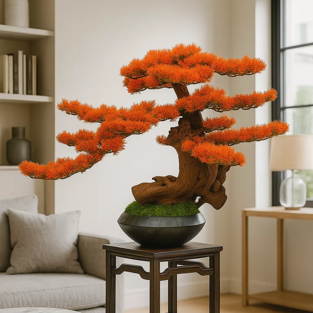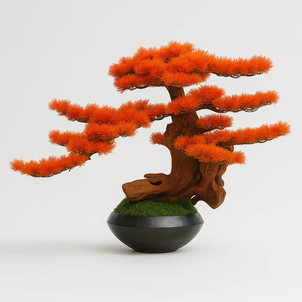 Avec ses branches horizontales parfaitement équilibrées et son tronc sculptural aux formes organiques, ce bonsaï évoque la force tranquille des paysages japonais. Son feuillage flamboyant d’un orange vif attire instantanément le regard et transforme chaque pièce en un espace de sérénité et d’inspiration.