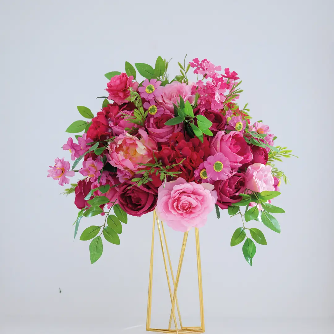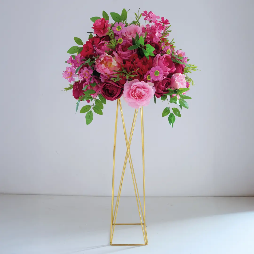 Apportez une touche de couleur et de raffinement à vos événements avec ce splendide centre de table boule florale décorative de 50 cm. Il combine de magnifiques roses, pivoines et fleurs variées dans des tons roses et rouges intenses, avec un feuillage vert réaliste, le tout monté sur un support doré design et élégant.