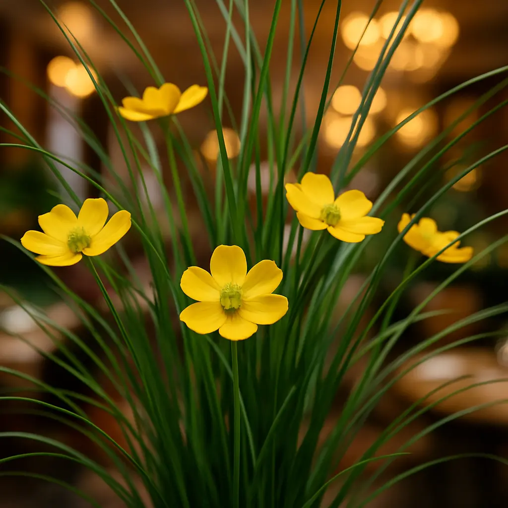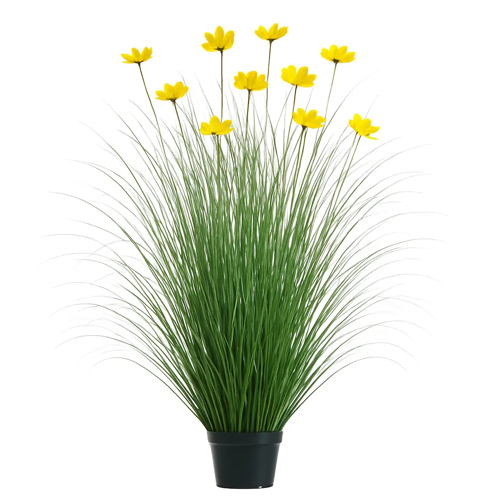 Apportez de la vie et de la couleur à votre intérieur avec cette graminée artificielle de 120 cm, embellie de 11 fleurs jaunes de coréopsis. Haute et élancée, cette plante est parfaite pour décorer un coin de pièce, une entrée, une vitrine ou un salon avec une touche végétale éclatante et sans contrainte.