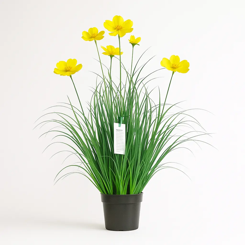Illuminez vos espaces avec cette graminée artificielle de 60 cm, agrémentée de 6 jolies fleurs jaunes de coréopsis au rendu éclatant. Son feuillage fin et souple, combiné à ces petites fleurs légères, crée une ambiance fraîche et joyeuse, parfaite pour une cuisine, une salle à manger, un bureau ou une chambre.