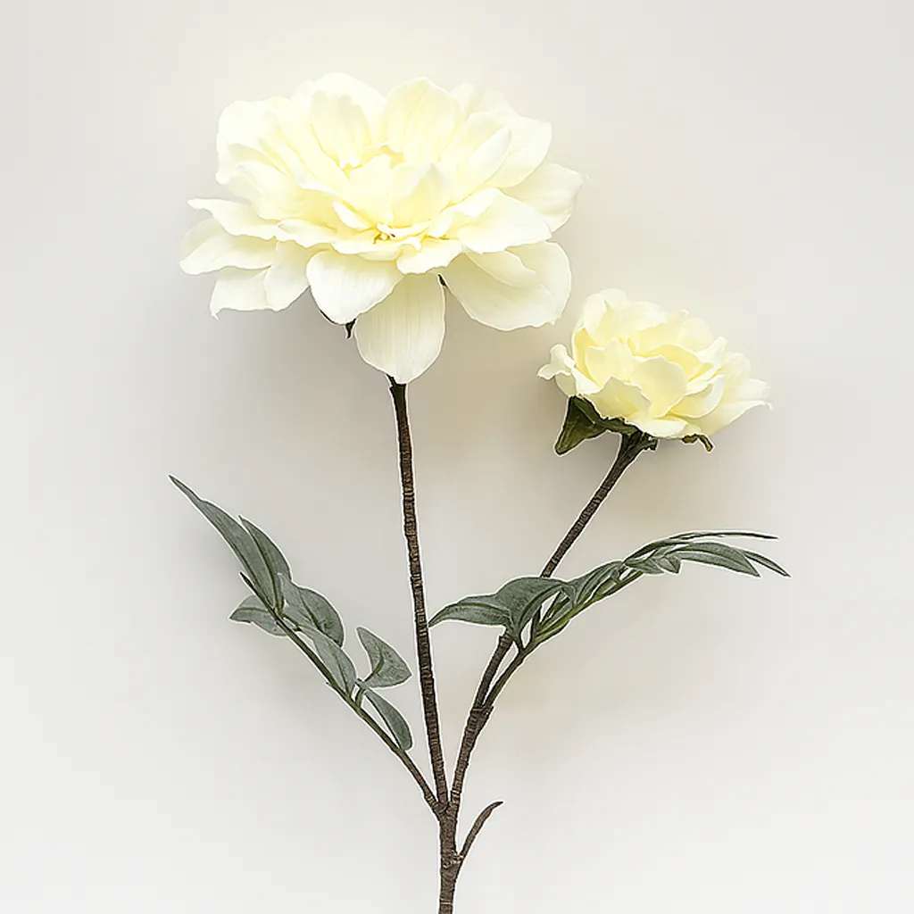 Apportez douceur et raffinement à votre décoration avec ce dahlia blanc artificiel à deux fleurs. Haut de 54 cm, il se distingue par sa silhouette gracieuse et ses pétales réalistes, parfaitement adaptés à une ambiance sobre et naturelle.