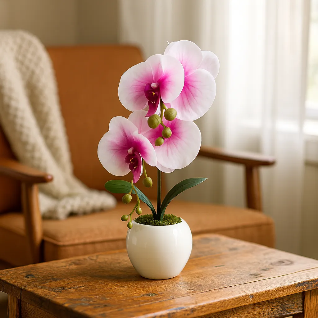 Ajoutez une note florale sophistiquée à votre décoration avec cette orchidée papillon artificielle de 30 cm, présentée dans un pot en céramique élégant. Fabriquée en plastique de haute qualité, elle imite parfaitement l’apparence naturelle d’une vraie plante, sans les contraintes d’arrosage ou d’entretien.