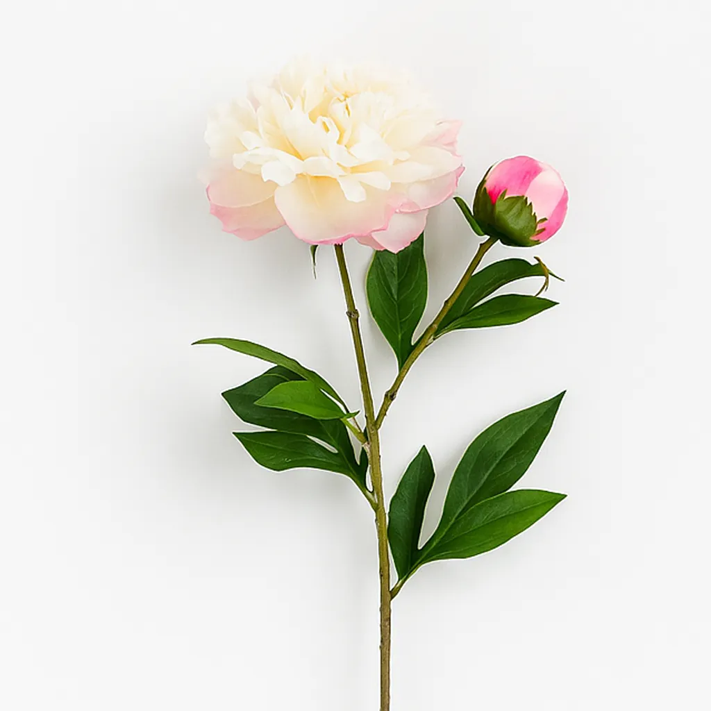 Une pivoine blanche et rose élégante avec son petit bouton, idéale pour une déco florale raffinée.